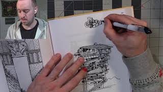 My favorite pens are probably Rotring Isographs, and I like Crescent Rendr and Moleskine Sketchbooks, or Bristol paper for loose-leaf. I also enjoy a wide variety of fountain pens, glass dip pens, etc. I just like drawing lines!